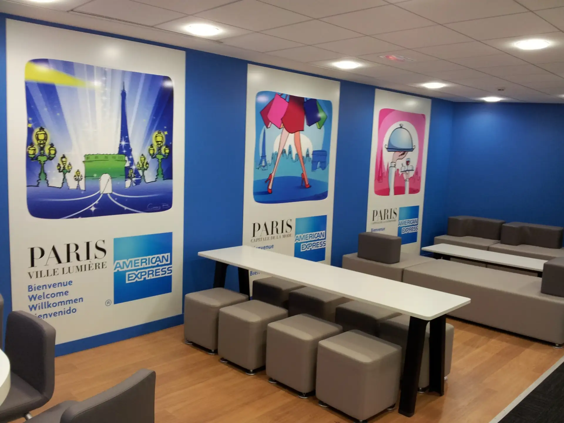 Signalétique intérieure pour les bureaux American Express. Pose de panneaux directionnels et signalétique de bureaux aux couleurs de la marque, garantissant une navigation claire et une image professionnelle dans les espaces de travail.